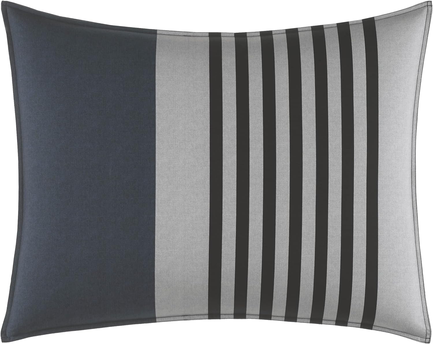 A bold engineered stripe with a printed textural effect makes a dramatic statement in a handsome palette of deep navy, charcoal, and grey on white with black accents. Engineered standard shams are a variation on the same theme, creating a dramatic focal point at the head of the bed. A woven Nautica logo patch topstitched to the duvet cover corner adds a signature finish to this comfortable, all cotton bedding. Layer in navy topstitched European shams as well as some of our signature accent pillows to complete the look. King duvet cover set dimensions: (92"x107", 20"x36").