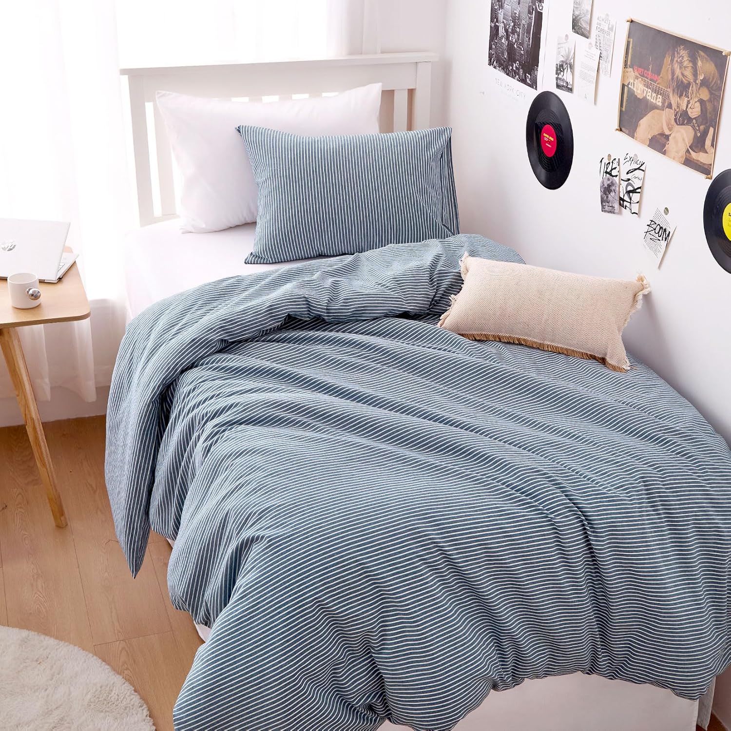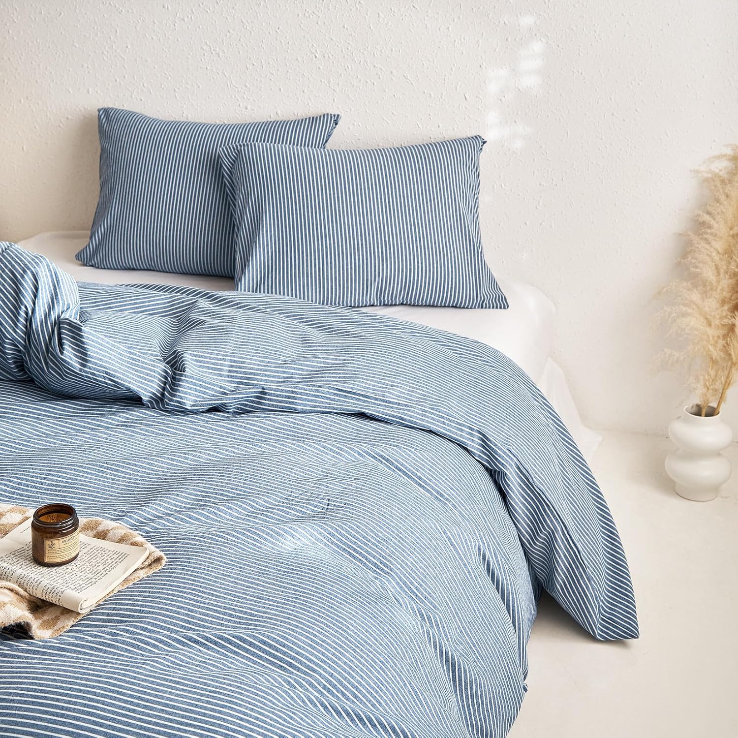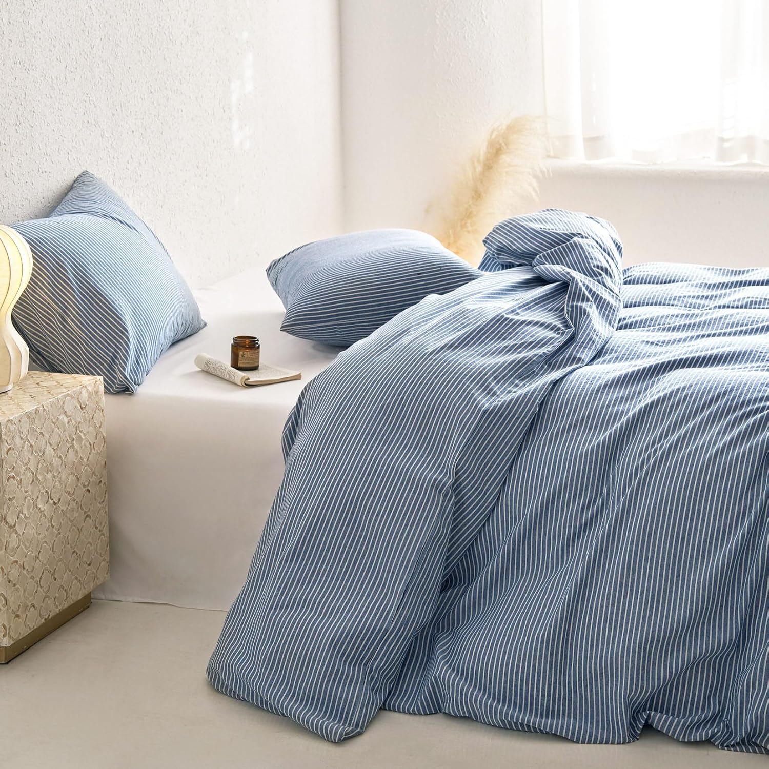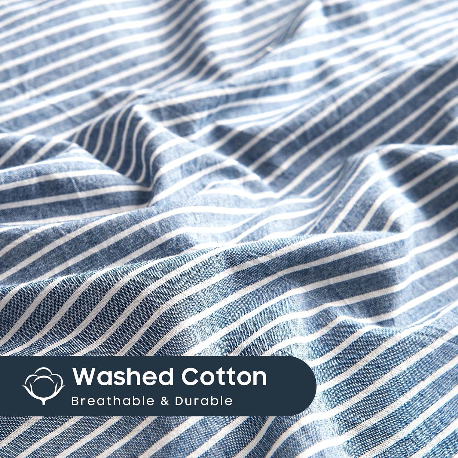 Wake In Cloud - Striped Cotton Duvet Cover Set, 100% Washed Cotton Textured Percale Bedding Set, Ticking Stripe Pinstripe Farmhouse, 3 Pieces, Denim Blue, Queen Size